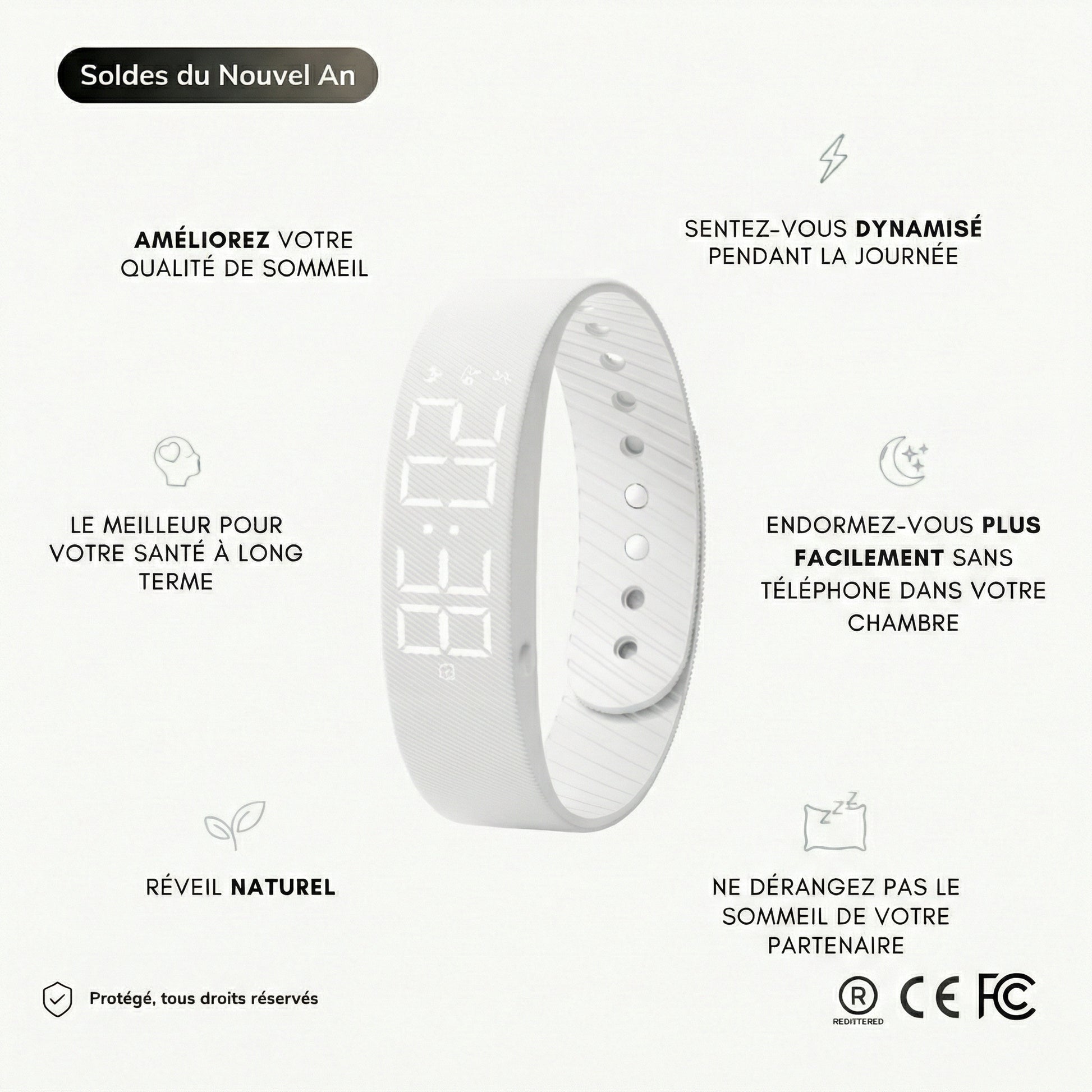 Alors que les montres connectées offrent de nombreuses fonctionnalités, le réveil RiseFloow est spécialement conçu pour vous aider à vous réveiller, et non pour suivre votre forme physique ou afficher des notifications. Contrairement à la plupart des montres connectées, elle émet une vibration puissante qui augmente progressivement, spécialement conçue pour les gros dormeurs. Dotée d'une batterie longue durée de plus de 14 jours, elle est conçue pour le sommeil, de sorte que vous ne la sentirez même pas lorsque vous la porterez. Elle vous garantit un réveil efficace sans déranger les autres, ce qui en fait une solution unique pour commencer votre journée en toute sérénité et avec énergie.